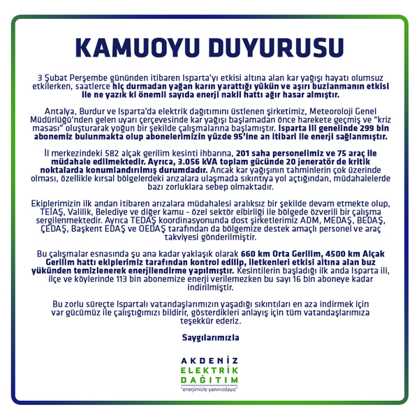 Akdeniz Elektrik Dağıtım A.Ş’den yapılan açıklamada ise elektrik kesintilerinin nedeninin “Saatlerce hiç durmadan yağan karın yarattığı yükün ve aşırı buzlanma”  olarak belirtilmesi dikkat çekti. Isparta ili genelindeki 299 bin elektrik abonesinin yüzde 95’ine bugün itibari ile enerji sağlandığı kaydedilen AEDAŞ’ın açıklamasında, “Kesintilerin başladığı ilk anda Isparta ili, ilçe ve köylerinde 113 bin abonemize enerji verilemezken bu sayı 16 bin aboneye kadar indirilmiştir” denildi.