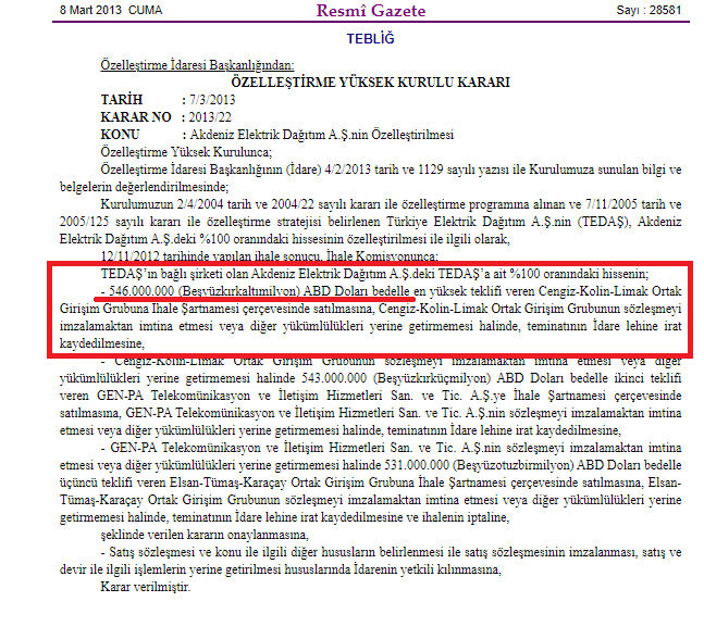 AEDAŞ’ın özelleştirilmesiyle ilgili Resmi Gazete’de yayımlanan karar.