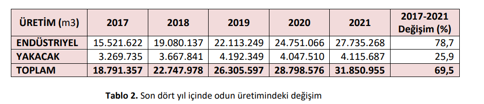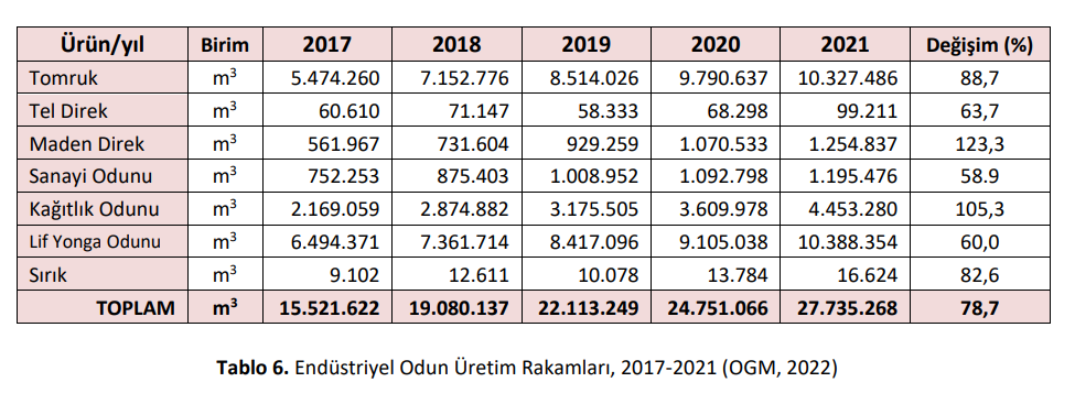 Diğer yandan; Türk lirasının döviz karşısında değer kaybetmesiyle birlikte tomruk ve kereste odununun 2015 yılında 40 bin ton olan ihracat miktarının 2021 yılına gelindiğinde artarak 354 bin tona çıkması, buna karşılık 2015 yılında 1,4 milyon ton olan ithalat miktarının da 2021 yılında 316 bin tona düşmüş olması ülkedeki odun üretimi ve tüketimindeki yanlış politikaları kanıtlar niteliktedir. Türkiye 2 bu tür uygulamalarla son yıllarda tıpkı Güney Amerika ve Afrika kıtasındaki ülkeler gibi odun üretimi amacıyla kendi ormanlarına kalıcı zararlar verecek şekilde yüklenmektedir. Türkiye ormancılığının görevi; ormanlarımızdan veriminin üstünde kesim yapıp, hesapsızca kurulmuş olan sanayiyi desteklemek değildir. Türkiye ormancılığının asıl görevi; dağlık arazi yapısına uygun olarak ormanların yetişmesini, yetiştirilmesini, toprakların korunmasını ve sellerin önlenmesini sağlamak; yıllık artımın elverdiği ölçüde ve sürdürülebilir bir çerçevede odun hammaddesi üretmektir.”