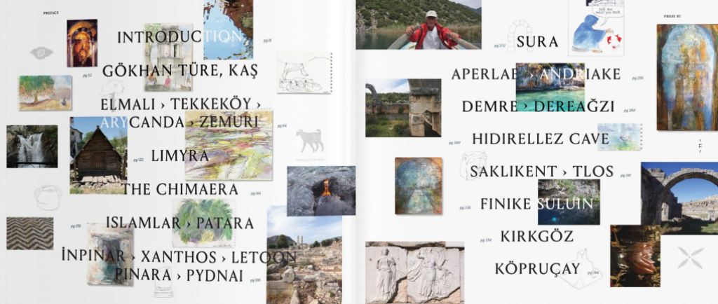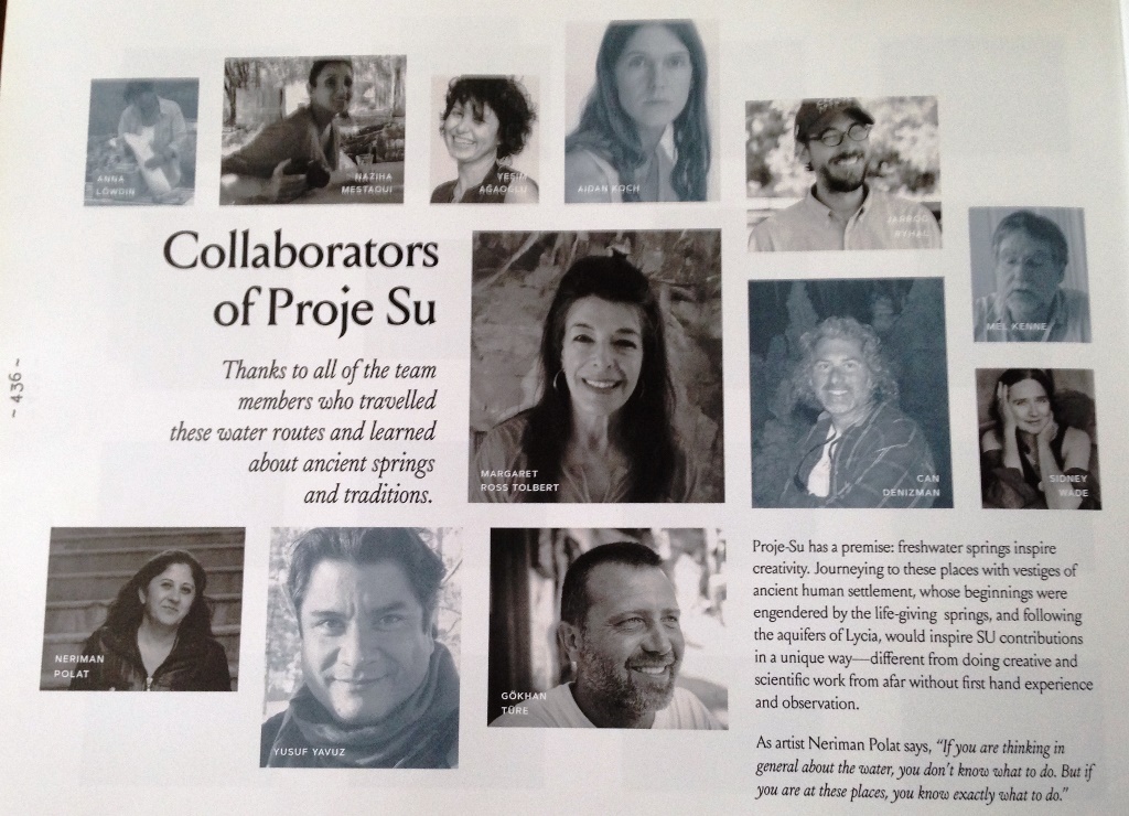 Chicago’daki IDEO (Communication Design Lead)’in grafik tasarımcısı Jarrod Ryhal, kitaplar ve filmler için tasarım çalışmaları yaparak 12 yıl benimle çalıştı ve Proje-Su’yun odak noktası olan her yeri araştırmak için iki kez Likya’ya geldi. Kitap için yaptığı tasarım çalışması, Likya coğrafyasına, yerüstünde ve yeraltında akan sulara bir övgü niteliğinde, ustaca hazırlanmış ve karmaşık bir belgedir. İsveçli heykeltıraş ve ressam Anna Lowdin de bizimle birlikte seyahat etmek ve çalışmaları için ilham almak için Likya’ya iki gezi yaptı. Türkiye’de yaşayan çevirmen ve şair Mel Kenne, Likya’yı dolaşarak Leto’yu ve kültünün tarihini anlatan bir makale (Leto’nun Toprakları ve Suları) yazdı. Türkiye’de yaşayan antropolog ve mimar Dr. Emine İncirioğlu, Temiz Adam (Su, saflık ve ahlak, Türkiye’de temizlik kültürü) başlıklı yazısıyla yıllardır aklımdaki soruları yanıtladı. Ayrıca ABD’deki çağdaş sanat küratörü Dr. Jan Schall, çalışmalarım hakkında yazdı.
