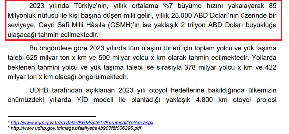 KGM’nin hazırlattığı Antalya-Alanya otoyolu projesinin ÇED raporunda, 2023’te Türkiye’de kişi başına düşen milli gelirin 25 bin doların üzerine çıkacağı, karayollarındaki yıllık yolcu sayısının ise 378 milyar kişi olacağı öne sürülerek şu ifadelere yer veriliyor: “2023 yılında Türkiye’nin, yıllık ortalama %7 büyüme hızını yakalayarak 85 Milyonluk nüfusu ile kişi başına düşen milli geliri, yıllık 25.000 ABD Doları’nın üzerinde bir seviyeye, Gayri Safi Milli Hâsıla (GSMH)’ın ise yaklaşık 2 trilyon ABD Doları büyüklüğe ulaşacağı tahmin edilmektedir. Bu öngörülere göre 2023 yılında tüm ulaşım türleri için toplam yolcu ve yük taşıma talebi 625 milyar ton x km ve 500 milyar yolcu x km olarak tahmin edilmektedir. Yollarda beklenen tahmini yolcu ve yük taşıma talebi ise sırasıyla 378 milyar yolcu x km ve 422 milyar ton x km olacağı öngörülmektedir.”
