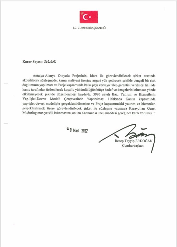 Antalya-Alanya otoyolu, “Ankara-İzmir Ayrımı Afyonkarahisar-Antalya-Alanya Otoyolu” projesinin bir ayağını oluşturuyor. Cumhurbaşkanı Recep Tayyip Erdoğan’ın imzasıyla 8 Mart 2022 tarihinde Resmi Gazete’de yayımlandığı açıklanan kararda, Antalya-Alanya otoyolunun tamamlanması için yüklenici firma ile yapılacak sözleşmede KGM’nin yetkili kılınması sağlanıyor. Yapılacak sözleşmede, kamu maliyesine en az yük getirecek şekilde dengeli bir risk dağılımı yapılması gerektiği vurgulanan, Kararda, “Proje kapsamında katkı payı ve/veya talep garantisi verilmesi halinde kamu tarafından üstlenilecek koşullu yükümlülüğün bütçe hedef ve dengelerini olumsuz yönde etkilemeyecek şekilde düzenlenmesi kaydıyla” ifadeleri dikkat çekiyor.