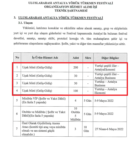 Antalya Büyükşehir Belediyesi tarafından 6-8 Mayıs tarihlerinde organize edilmesi planlanan ‘Uluslararası Antalya Yörük Türkmen Festivali’nin hazırlıkları sürerken, etkinlikle ilgili ayrıntılar da netleşmeye başladı. Büyükşehir Belediyesi tarafından ihale yoluyla özel bir organizasyon şirketine verilmesi planlanan etkinlikle ilgili ihalenin 11 Nisan 2022 tarihinde yapılacağı öğrenildi. Festivalle ilgili hazırlanan ihale teknik şartnamesinde yer verilen detaylar, organizasyonun milyonlarca lira maliyeti olacağına işaret ederken bazı Yörük derneği başkanları yüksek bütçeli olacağı beklenen etkinliği eleştirdi. Yurt içi ve yurt dışından toplam 360 uçak bileti, bir kısmı 5 yıldızlı otellerde olmak üzere 2700 konaklama ve festival boyunca toplam 13 bin kişilik yemek alımı yapılması planlanan festivalin ihale şartnamesinde yüklenici firmadan protokol ve halka ayrı tribün ve farklı ebatlarda Yörük yağlığı temin edilmesinin istenmesi dikkat çekiyor.