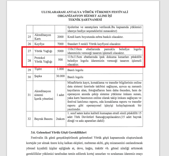 Etkinlik için 2 bin akreditasyon kartı bastırılması da istenen şartnameye göre festivalde dağıtılmak üzere üzerinde Antalya Büyükşehir Belediyesi’nin logosu bulunan 115×115 cm ebatlarında 500 ‘protokol Yörük yağlığı’, (Puşi) 110×110 ebatlarında 5 bin Yörük yağlığı, 7 bin adet Yörük kefiyesi, logolu 30 bin şapka ile 1000 tişört satın alınacak.