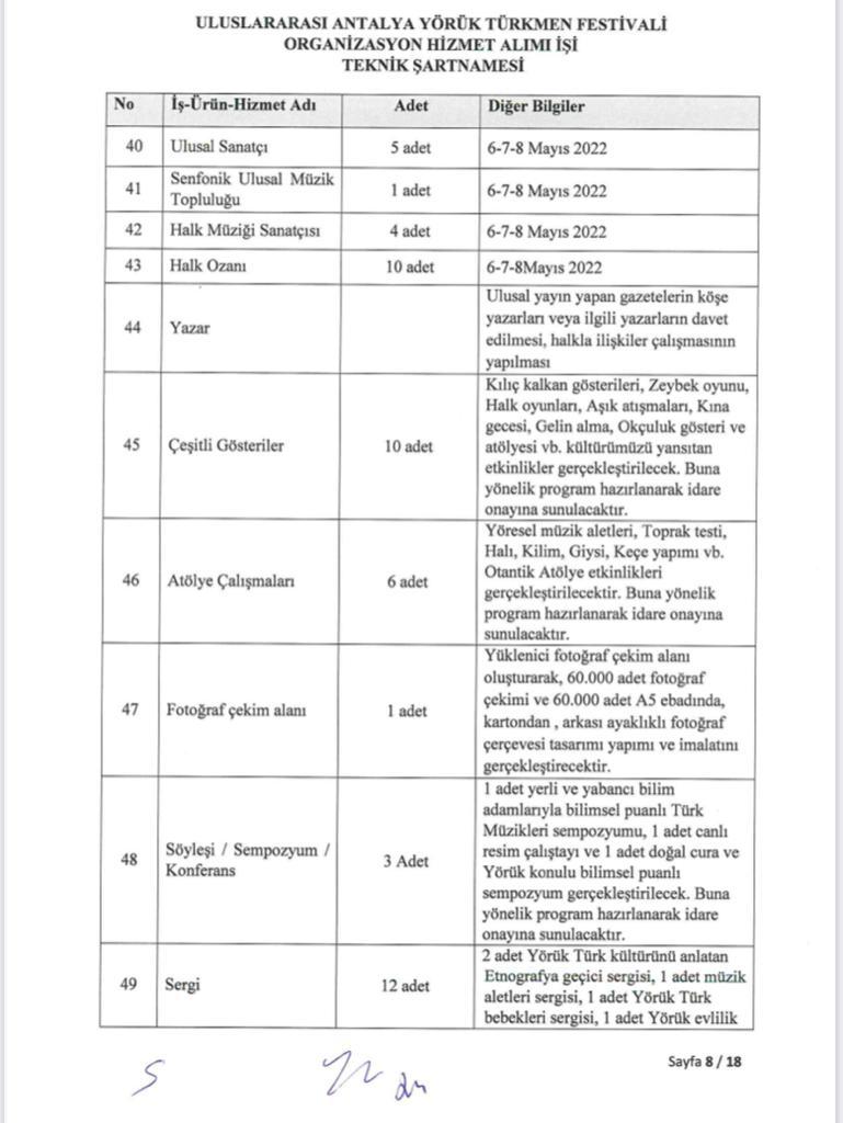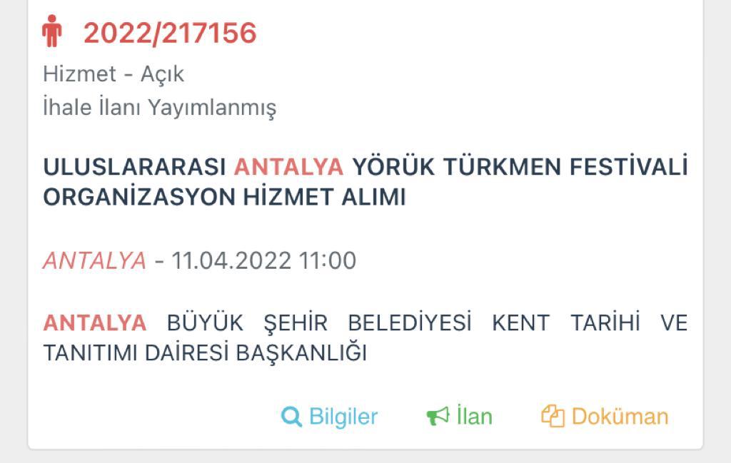 Elektronik Kamu İhale Platformu (EKAP) üzerinden isteklilerin ilgisine sunulan ihale şartnamesinde, “İhaleye konu festivalin organizasyonu yurt içi ve Antalya ilinde birbiriyle eşgüdümlü gerçekleşecek genel faaliyetler ve festival faaliyetlerinden oluşacak bir dizi mal ve hizmet alımını gerektirmektedir” ifadelerine yer veriliyor.