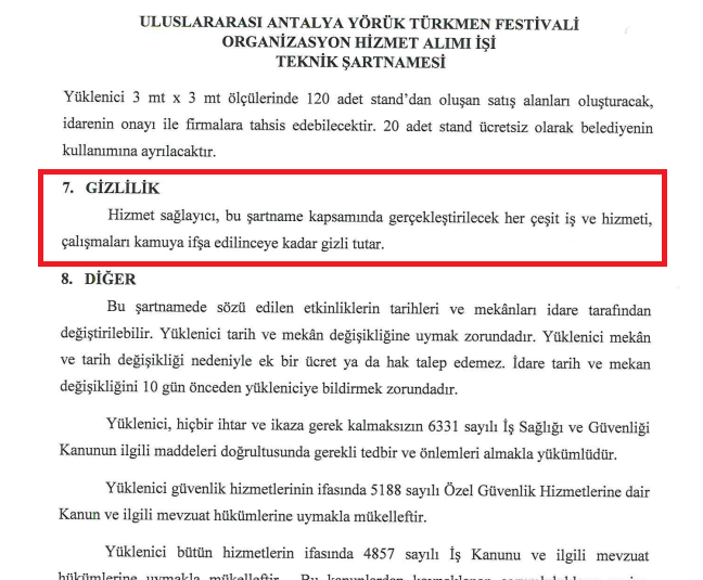 Festivalle ilgili yapılması öngörülen harcamalara ilişkin bilgiye yer verilmeyen 18 sayfalık ihale şartnamesinde, “Hizmet sağlayıcı bu şartname kapsamında gerçekleştirilecek her çeşit iş ve hizmeti, çalışmaları kamuya ifşa edilinceye kadar gizli tutar” ifadelerine yer verilmesi dikkat çekiyor.