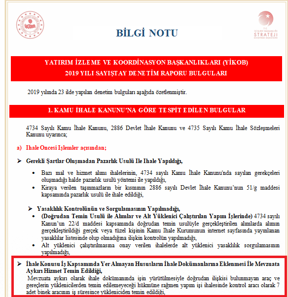 “Sayıştay’ın 2021 Yılı Taslak Denetim Raporu’nda şu ifadeler yer almaktadır: ‘Antalya Valiliği Yatırım İzleme ve Koordinasyon Başkanlığı (YİKOB) işin gerektirdiği ihtiyacı ve kapsamını aşacak şekilde Başkanlığın genel ve sürekli ihtiyaçları şeklinde tanımlanabilecek binek otomobil ve ofis gereçlerinin bu sözleşmeler üzerinden temin edildiği tespit edilmiştir. Her ne kadar temin edilen otomobil, araç ve gereçlerin kontrollük hizmetlerinde kullanılacağı ifade edilmiş olsa da ihale edilen yapım işlerinin şartnamesinde yer alan araçların işin niteliğine ve ihtiyacına binaen olmasından ziyade Başkanlığın yönetici kadrosunda yer alan personelin genel ve sürekli ihtiyaçlarının teminine yönelik olduğu anlaşılmıştır.’