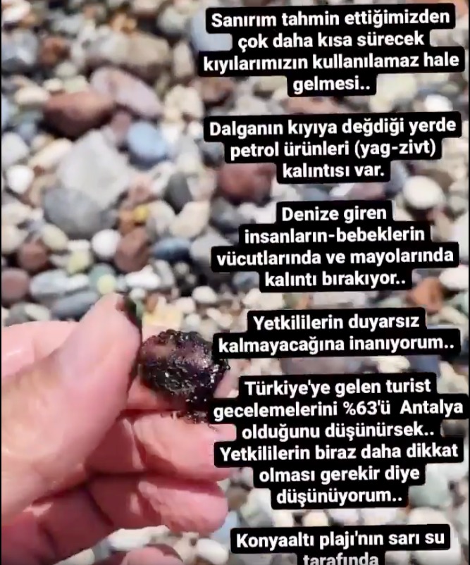 Türk turizminin başkenti olarak gösterilen Antalya kıyılarında iki gündür petrol kaynaklı kirlilik endişe yarattı. Lara ve Konyaaltı plajlarında hafta sonu denize giren vatandaşların vücutlarına yapışan zift benzeri maddenin görüntüleri yüzlerce kişi tarafından sosyal medyada paylaşıldı. Konu hakkında yetkili kurumlardan bir açıklama bekleyen kent halkı, ‘Mavi Bayrak’ niteliği verilen plajlarda zifte bulanmış çocukların görüntülerini paylaştı.