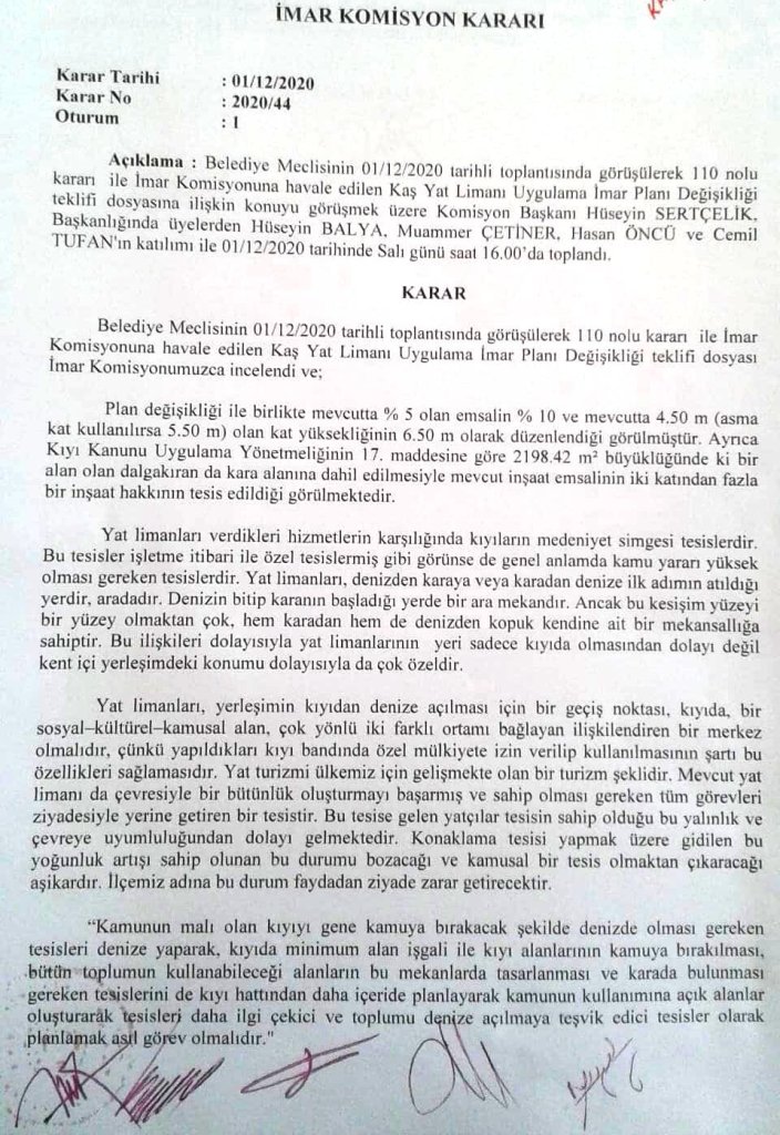 Kaş Belediyesi İmar Komisyonu, daha önce konuyla ilgili Aralık 2020’de hazırladığı raporda plan değişikliği talebine ilişkin şu görüşlere yer vermişti: “Yat limanları her ne kadar özel girişime izin verilmiş olsa da esasen kamusal alanlardır. Mevcut yat limanı çevresiyle bütünlük oluşturmayı başarmıştır ve görevlerini ziyadesiyle yerine getirmektedir. Yatçılar tesisin sahip olduğu bu yalınlık ve çevre uyumluğundan dolayı burayı tercih etmektedirler. Konaklama tesisi yapmak üzere gidilen bu yoğunluk artışı sahip olunan bu durumu bozacağı ve kamusal bir tesis olmaktan çıkaracağı aşikârdır. İlçemiz adına bu durum faydadan ziyade zarar getirecektir.”