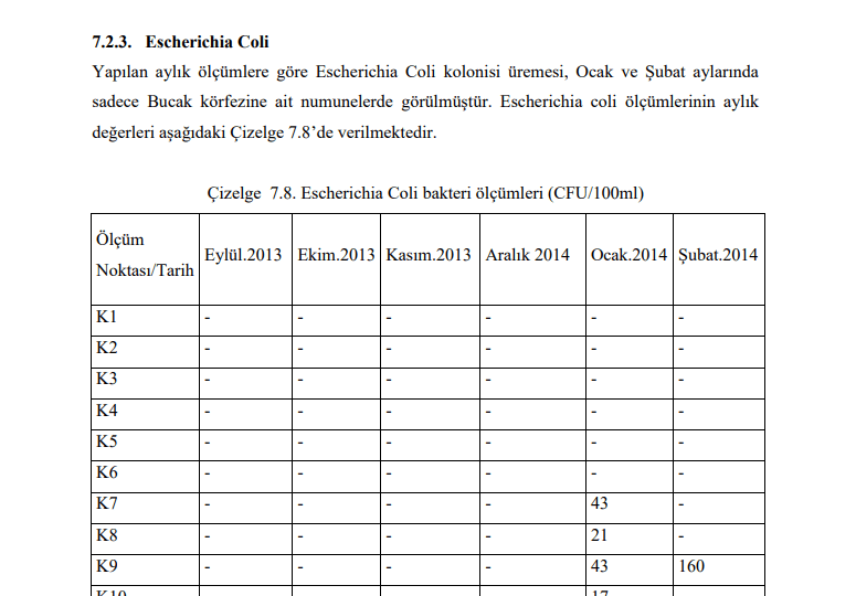 Açıklamada, 2014 yılında Batı Akdeniz Kalkınma Ajansı (BAKA), Kalkınma Bakanlığı ve Kaş Turizm ve Tanıtma Derneği için hazırlanan Kaş’ın deniz ve kıyı alanlarının korunmasıyla ilgili bir raporda, bölgedeki mevcut kirleticiler arasında gösterilen Kaş Marinanın etkisiyle Bucak Denizi olarak anılan koyun riskli bölge olarak gösterildiğinin de altı çizilerek şöyle denildi: “Bucak Körfezi’nde koliform kirliliği oluştuğu tespit edilmiştir. Bu kirlilik zorunlu değerden düşük olmakla birlikte, mevcudiyetleri suda dışkı kaynaklı zararlı patojenlerin de var olabileceğini göstermektedir. Escherichia coli ölçümleri de Ocak ve Şubat ayında Bucak körfezinde dışkı kaynaklı kirliliğin bulunduğunu göstermektedir. Tehlikeli bir bakteri türü olan pseudomonas aeuroginosa en fazla Marina girişindeki K8 noktası ile Liman önündeki K3 noktasında ölçülmüştür.”