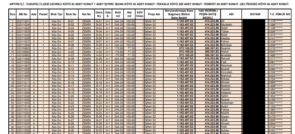 Baraj projesi nedeniyle geçtiğimiz hafta yeni yerleşimdeki hükümet konağına taşınma işlemleri başladı. Yusufeli Kaymakamlığı’nın resmi internet sitesinde ilçeye bağlı Çevreli, İşhan, Tekkale, Çeltikdüzü ve Yeniköy köylerinde baraj mağduru aileler için yapılan konutların ödeme koşulları yayınlandı. Buna göre TOKİ tarafından inşa edilen yeni evlerin borçlandırmaya esas fiyatları 1.183.497 ile 1.189.166 TL arasında değişiyor. Evlerin tutarlarının peşin olarak ödenmesi durumunda ise 414 bin ila 416 bin TL gibi rakamlar çıkarılıyor.