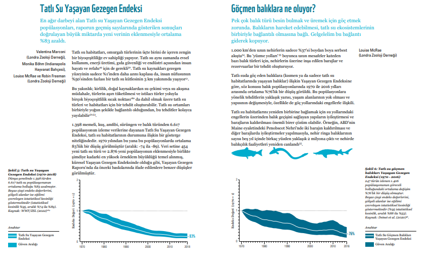 Tatlı su habitatlarının, omurgalı türlerinin üçte birini de içeren zengin bir biyoçeşitliliğe ev sahipliği yaptığının altı çizilen raporda, şu bilgilere yer veriliyor: “Tatlı su aynı zamanda evsel kullanım, enerji üretimi, gıda güvenliği ve endüstri açısından insan hayatı ve refahı için de gerekli. Tatlı su kaynakları gezegen yüzeyinin sadece yüzde 1’inden daha azını kaplasa da, insan nüfusunun yüzde 50’sinden fazlası bir tatlı su kütlesinin 3 km yakınında yaşıyor. Bu yakınlık; kirlilik, doğal kaynaklardan su çekimi veya su akışına müdahale, türlerin aşırı tüketilmesi ve istilacı türler yoluyla birçok biyoçeşitlilik sıcak noktası182 da dâhil olmak üzere tatlı su türleri ve habitatları için bir tehdit oluşturabilir. Tatlı su ortamları birbiriyle yoğun şekilde bağlantılı olduğundan, bu tehditler kolayca yayılabilir. 1.398 memeli, kuş, amfibi, sürüngen ve balık türünden 6.617 popülasyonun izleme verilerine dayanan Tatlı Su Yaşayan Gezegen Endeksi, tatlı su habitatlarının durumuna ilişkin bir gösterge niteliğindedir. 1970 yılından bu yana bu popülasyonlarda ortalama 83’lük bir düşüş görülmüştür.”