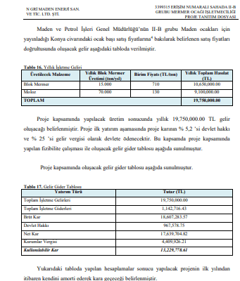 Proje için hazırlanan ÇED raporunda, çevre, maden ve jeoloji mühendisleri ile bir de işletme uzmanının imzası bulunurken biyolog ya da ormancılıkla ilgili bir uzmanın yer almaması dikkat çekiyor. Özensizce hazırlanan ÇED raporunda, mermer ocağı projesi için yılda 15 bin ton mermer üretileceği ve bu üretimden yılda 19 milyon 750 bin TL gelir elde edileceği belirtiliyor. Raporda yer verilen bilgiye göre mermer ocağı projesinin yıllık net kârının ise 17 milyon 639 bin TL olduğu kaydediliyor. ÇED raporunda, öngörülen yıllık proje gelirinin 967 bin TL’lik kısmının ‘devlet hakkı’, 4.4 milyonluk kısmının ise kurumlar vergisi olarak ayrılacağı belirtiliyor.