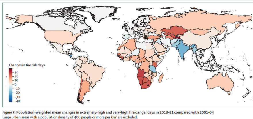 (The Lancet raporunda yeryüzünde kuraklık ve yangın riskini gösteren harita, altta):