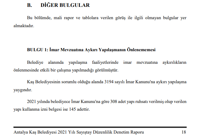 İç İşleri Bakanlığı’nın bu raporuna karşın Kaş’ta hız kesmeden süren kaçak yapılaşma Sayıştay denetçilerinin de raporuna yansıdı. Kaş Belediyesi’nin 2021 yılı faaliyetleriyle ilgili yapılan denetimlerin ardından hazırlanan ve Ekim 2022’de yayımlanan Sayıştay Raporunda, imar mevzuatına aykırı yapılaşmanın önlenemediği belirtilerek şöyle denildi: “Belediye alanında yapılaşma faaliyetlerinde imar mevzuatına aykırılıkların önlenmesinde etkili bir çalışma yapılmadığı görülmüştür. Kaş Belediyesinin sorumlu olduğu alanda 3194 sayılı İmar Kanunu’na aykırı yapılaşma yaygındır. 2021 yılında belediyece İmar Kanunu’na göre 308 adet yapı ruhsatı verilmiş olup verilen yapı kullanma izni belgesi ise 145 adettir.