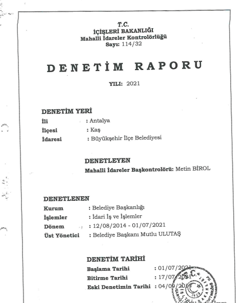 İç İşleri Bakanlığı Mahalli İdareler Kontrolörlüğü tarafından Temmuz 2021’de yapılan denetimin ardından hazırlanan raporda, 2014-2021 arası dönemde Kaş’ta toplam 2291 adet kaçak yapı tespit edildiği kaydedildi. Ruhsatsız ya da ruhsat eklerine aykırı olarak nitelenen yapılar için Kaş Belediyesi’nin yeterli denetim yapmadığına işaret edilen raporda, şu ifadelere yer veriliyor: “Ruhsatsız veya ruhsat eklerine aykırı inşaat yapanlara 3194 sayılı İmar Kanununa göre para cezası uygulanması yerine, zabıta birimince kabahatler kanununun 323. ve 37. maddelerine göre para cezası verildiği incelenmiştir. Bazı idari yaptırım karar tutanaklarında, hakkında işlem yapılan kişinin imzasının yer almadığı, dosyasında kararın ilgilisine tebliğ edildiğine ilişkin herhangi bir kayda rastlanmadığı incelenmiştir. Bezirgân Mahallesi, 195 ada 54 parsel üzerinde izinsiz inşaat yaptığı tespit edilen kişi için düzenlenen idari yaptırım tutanağı konuya örnektir.”