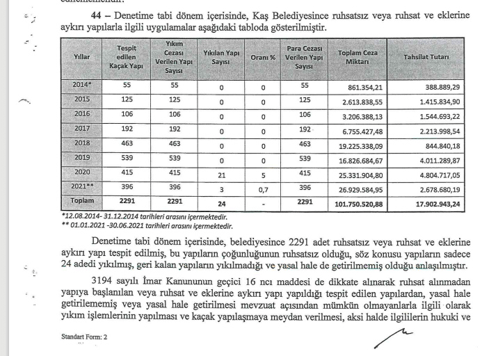 Kaş’taki imar mevzuatına aykırı yapı stokunun değerinin 2 milyar TL’nin üzerinde olduğunun tahmin edildiğine değinilen Sayıştay raporunda, şu ifadelere yer verildi: “Yıkım kararlarının uygulanması durumunda, hem mahallinde imar planı yapılmadığı ve köy statüsünü de kaybettiği için yasal olarak konut yapma imkânı bulunmayan yerel halkın mağdur edileceği, hem bölgeye yapılan yüksek maliyetli turistik konutlar açısından önemli bir milli servet ve yatırım değeri kaybı söz konusu olacağı kabul edilmelidir. Kaş Belediyesi yetki alanı içinde imar mevzuatına aykırı olarak hızlı bir yapılaşma faaliyeti olduğu, yapılaşmanın büyük oranda özel çevre koruma alanları dâhil imarsız bölgelerde bulunduğu, çeşitli kanallardan yapılan çok sayıda şikâyete rağmen yasal olmayan yapılaşma faaliyetlerinin büyük kısmının tespit edilemediği, tespit edilenlerin yasal olmayan faaliyetlerinin durdurulamadığı, ilgili kişilere kesilen idari para cezalarının tahsil edilemediği, mahkemelerin imar kirliliği suçundan mahkûmiyet kararı vermeleri durumunda idari para cezalarının iptalinin gerektiği, mahkûmiyet kararlarının çoğunlukla adli para cezasına çevrilerek infaz edildiği, adli para cezalarının aynı konuda verilmiş olan idari para cezalarının yüzde 5’i civarında olduğu tespit edilmiştir. Kısaca bölgede kontrolsüz bir yapılaşma mevcut olup yetkili kurumlar tarafından yapılaşma süreci etkin bir şekilde yönetilememektedir.”