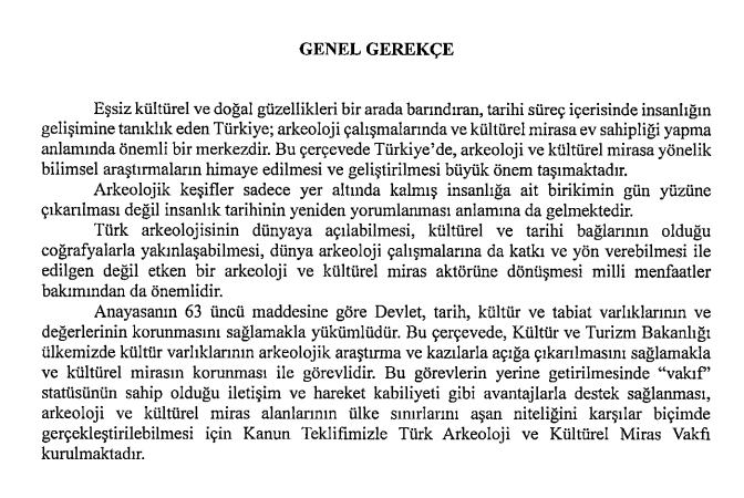 Vakıfla ilgili hazırlanan kanun teklifinin gerekçesinde, Türk arkeolojisinin dünyaya açılabilmesi, kültürel ve tarihi bağlarının olduğu coğrafyalarla yakınlaşabilmesi, dünya arkeoloji çalışmalarına da katkı ve yön verebilmesi ile edilgen değil etken bir arkeoloji ve kültürel miras aktörüne dönüşmesi milli menfaatler bakımından da önemli olduğu kaydedilerek şöyle denildi: “Kültür ve Turizm Bakanlığı ülkemizde kültür varlıklarının arkeolojik araştırma ve kazılarla açığa çıkarılmasını sağlamakla ve kültürel mirasın korunması ile görevlidir. Bu görevlerin yerine getirilmesinde vakıf statüsünün sahip olduğu iletişim ve hareket kabiliyeti gibi avantajlarla destek sağlanması, arkeoloji ve kültürel miras alanlarının ülke sınırlarını aşan niteliğini karşılar biçimde gerçekleştirilebilmesi için Kanun Teklifimizle Türk Arkeoloji ve Kültürel Miras Vakfı kurulmaktadır.”