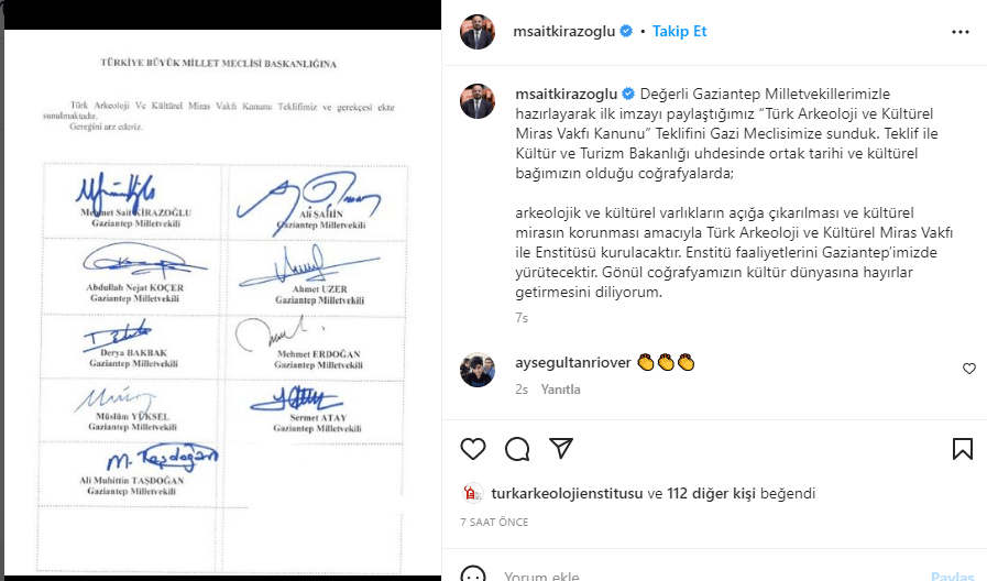 AKP’li Gaziantep milletvekillerinin ilk imzacısı olduğu ‘Türk Arkeoloji ve Kültürel Miras Vakfı Kanunu’ TBMM Başkanlığı’na sunuldu. AKP’li ve MHP’li isimlerden oluşan 60 milletvekilinin imzasıyla Meclise sunulan kanun teklifini sosyal medyadan duyuran Gaziantep Milletvekili Mehmet Sait Kirazoğlu, şu ifadeleri kullandı: “Değerli Gaziantep Milletvekillerimizle hazırlayarak ilk imzayı paylaştığımız ‘Türk Arkeoloji ve Kültürel Miras Vakfı Kanunu’ Teklifini Gazi Meclisimize sunduk. Teklif ile Kültür ve Turizm Bakanlığı uhdesinde ortak tarihi ve kültürel bağımızın olduğu coğrafyalarda; arkeolojik ve kültürel varlıkların açığa çıkarılması ve kültürel mirasın korunması amacıyla Türk Arkeoloji ve Kültürel Miras Vakfı ile Enstitüsü kurulacaktır. Enstitü faaliyetlerini Gaziantep’imizde yürütecektir. Gönül coğrafyamızın kültür dünyasına hayırlar getirmesini diliyorum.”