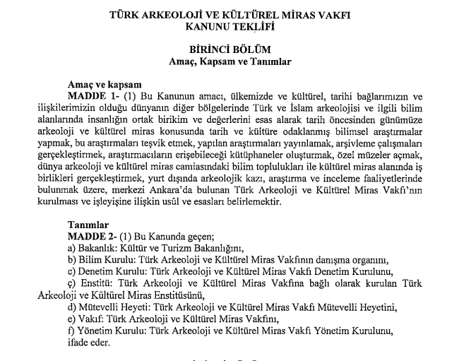 Kültür ve Turizm Bakanlığı’nın kültür mirasıyla ilgili yetki ve sorumluluklarının paylaşılması ve çalışmalara ‘hız’ kazandırılması amacıyla hazırlanan ‘Türk Arkeoloji ve Kültürel Miras Vakfı Kanunu’ 5 Ocak’ta TBMM Başkanlığı’na sunuldu. AKP’li 60 milletvekilinin imzasını taşıyan kanun teklifinin gerekçesinde, bakanlığın yürüttüğü görevlerin yerine getirilmesinde “vakıf statüsünün sahip olduğu iletişim ve hareket kabiliyeti gibi avantajlarla destek sağlanması, arkeoloji ve kültürel miras alanlarının ülke sınırlarını aşan niteliğini karşılar biçimde gerçekleştirilebilmesi” amaçlandığı kaydedildi. Kanun teklifine göre Gaziantep Büyükşehir Belediye Başkanı ile Bakan yardımcıları da kurulacak vakfın doğal mütevelli heyeti üyesi olacak. TBMM Eğitim, Kültür, Gençlik ve Spor Komisyonu’nda görüşülecek olan kanun teklifin daha sonra Meclis Genel Kuruluna gönderilmesi bekleniyor. Türkiye’nin Orta Asya, Balkanlar ve dünyanın değişik coğrafyalarındaki Türk-İslam kültür mirasıyla ilgili yetkileri de kapsayan kanun teklifinin görüşüleceği komisyonda AKP Erzurum Milletvekili Zehra Taşkesenlioğlu Ban ile AKP Sakarya Milletvekili Kenan Sofuoğlu da yer alıyor.