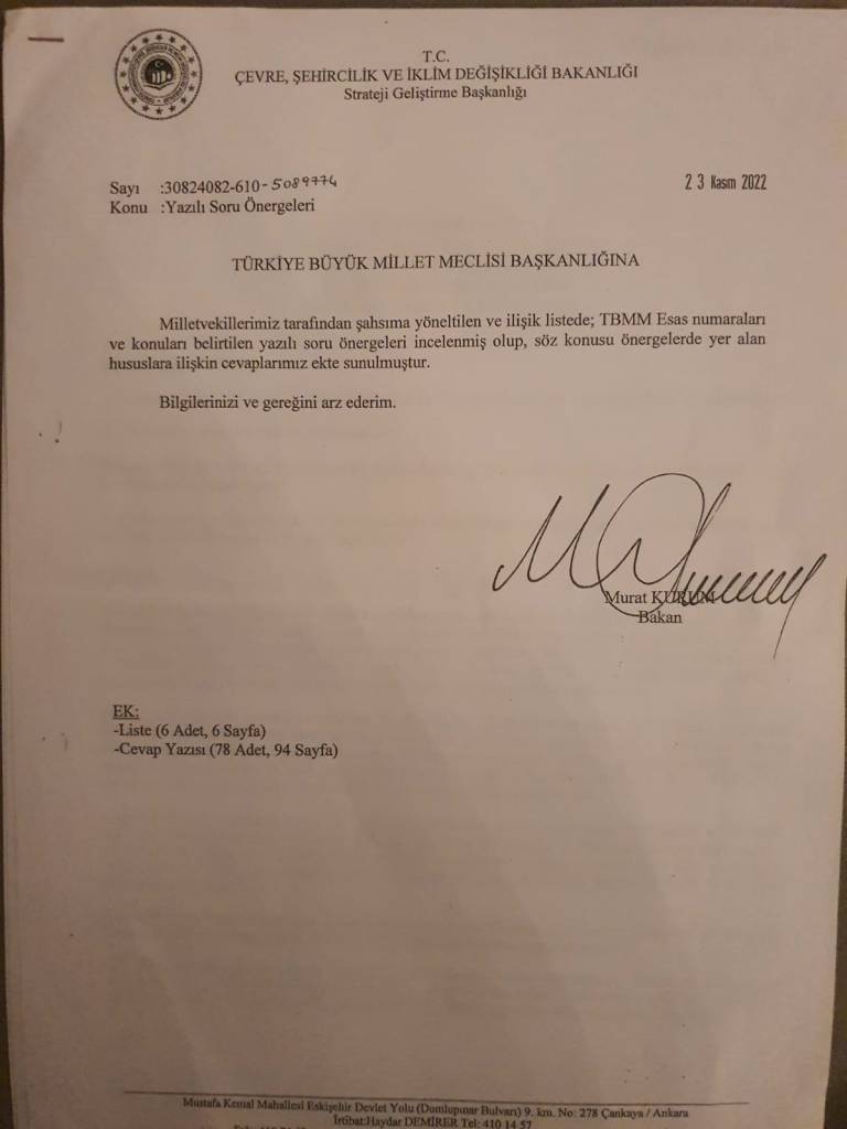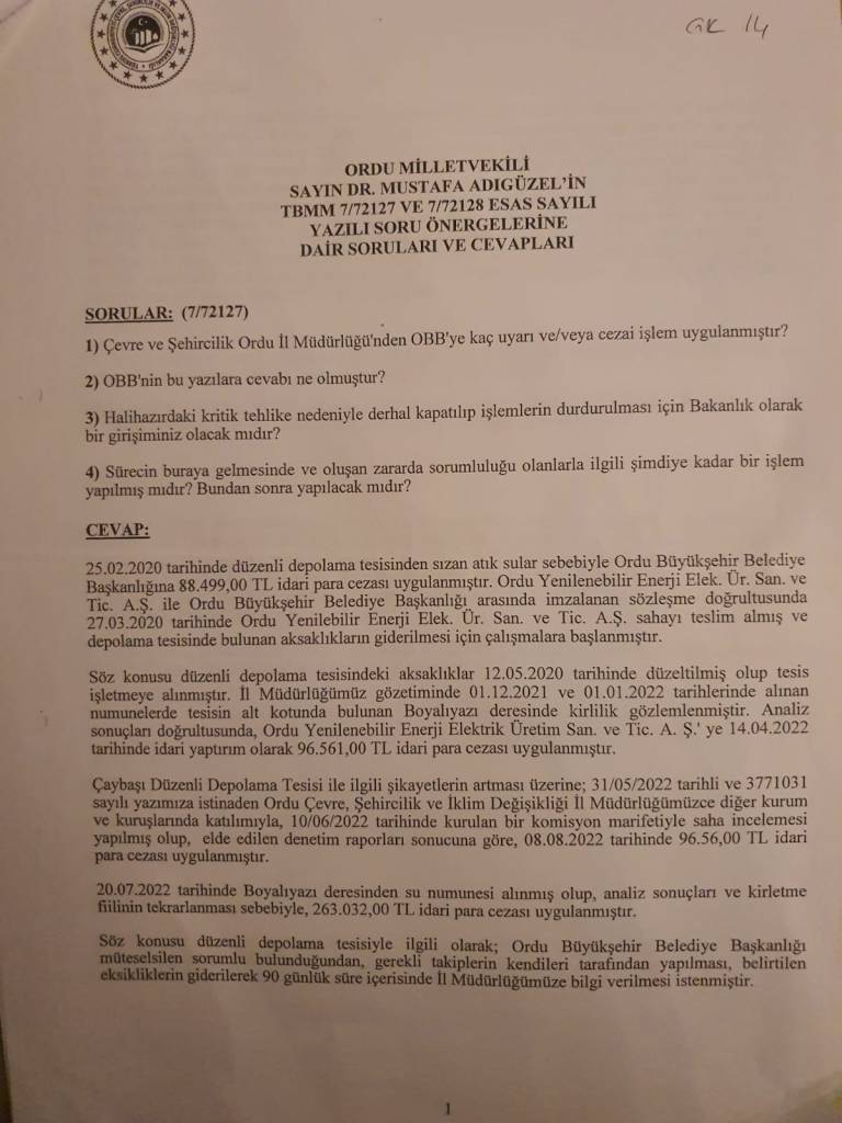 Bakan Murat Kurum imzasını taşıyan önerge yanıtında, katı atık tesisini işleten firmaya kirlilik nedeniyle 20 Temmuz 2022 tarihinde de 263.032,00 TL idari para cezası uygulandığı belirtilerek şu ifadelere yer veriliyor: “Söz konusu düzenli depolama tesisiyle ilgili olarak Ordu Büyükşehir Belediye Başkanlığı müteselsilen sorumlu bulunduğundan gerekli takiplerin kendileri tarafından yapılması, belirtilen eksikliklerin giderilerek 90 günlük süre içerisinde İl Müdürlüğümüze bilgi verilmesi istenmiştir.”