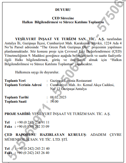 İlçe halkına proje hakkında bilgi verilmesi ve halkın görüşlerinin alınması amacıyla 8 Şubat Çarşamba günü Halkın Katılımı (ÇED) Toplantısı yapılacağı duyuruldu. Yapılması planlanan otel için hazırlanarak Çevre, Şehircilik ve İklim Değişikliği Bakanlığı’na sunulan Proje Tanıtım Dosyası’nda yer verilen bilgilere göre 4 katlı olarak inşa edilmesi planlanan otel 841 oda, 2508 yatak kapasitesine sahip olacak.