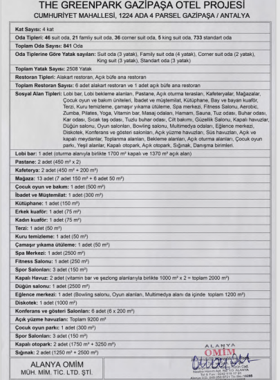 Projenin inşaatı aşamasında 250, işletme aşamasında ise 850 personelin çalışacağı kaydediliyor. İş insanı Adil Üstündağ’a ait Green Park otellerinin bir halkası olarak inşa edilecek olan ve ‘The Green Park Gazipaşa’ adıyla işletilmesi planlanan otelle ilgili proje dosyasında inşaat çalışmalarının 3 yıl süreceği kaydediliyor. Otelin yer seçimi ve yatırım gerekçesiyle ilgili bölümde ise şu görüşlere yer veriliyor: “Turizm bir ülkenin bacasız sanayisidir. Ayrıca Gazipaşa İlçesinde havalimanı bulunmakta olup havalimanının adı Gazipaşa Alanya Havalimanı olarak geçmektedir. Bu bölgede havalimanının bulunmasından dolayı yerli, yabancı turistlerin otele ulaşımı da kolay olacaktır ve bölgenin turizm potansiyeli artacaktır. Bölgede, her geçen gün artan yerli ve yabancı turist sayısı sonucu, konaklama talebinin artması nedeniyle, Yeşilyurt İnş. Ve Turizm San. Ve Tic. A.Ş. tarafından işletilmesi planlanan tesiste turizm konaklama talebinin karşılanması amaçlanmıştır.”