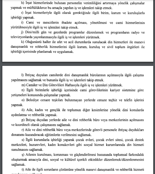 Aynı maddenin (jj) fıkrası eski yönetmelikte “Görev alanıyla ilgili verilen diğer görevleri yapmak” şeklinde iken, “Ülkemize sığınan yabancılara, her hangi bir sebepten dolayı yurt içinde göç etmek durumunda kalmış vatandaşlarımıza ve mevsimlik işçilere yönelik manevi danışmanlık hizmetlerini planlamak ve takip etmek” şeklinde değiştirildi.