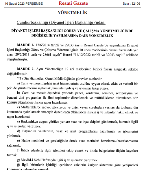 Bugünkü (16 Şubat 2023) Resmi Gazete’de yayımlanarak yürürlüğe giren yönetmelik değişikliğine göre Din Hizmetleri Genel Müdürlüğü, cami ve mescit dışında dini programlar ve ilmi toplantılar düzenleyebilecek, Diyanet tarafından uygun görülen yerlere vaaz ve irşat ekipleri gönderilebilecek. Diyanet, olağanüstü haller ile afet ve acil durumlarda sunulacak din hizmetleri ile manevi danışmanlık ve rehberlik hizmetlerini ilgili kurum, kuruluş ve sivil toplum örgütleri ile işbirliği içerisinde planlayıp uygulayabilecek.