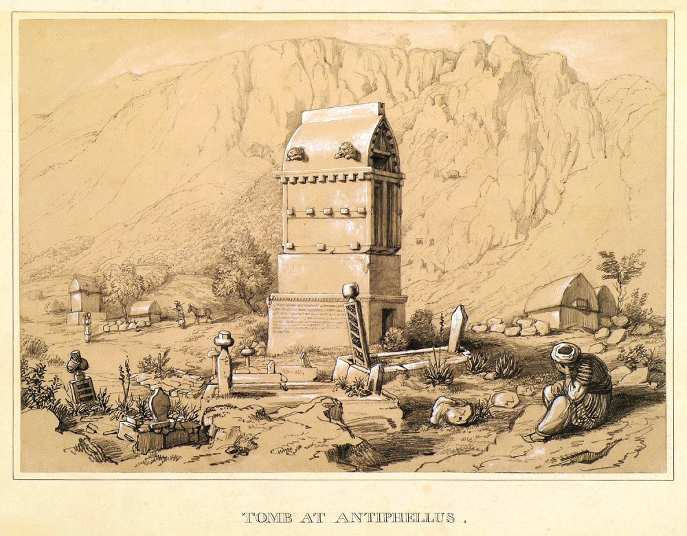 (Antiphellos (Kaş) 19 yüzyıldan bir gravür. Bugün Kaş Uzunçarşıda yer alan Likya tipi lahit mezar ilçenin simgelerinden biri. (Fellows, C.)