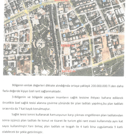 Av. Polat Balkan’ın plan tadilatıyla ilgili komisyon raporunda da yer alan itiraz başvurusunda, mevcutta binanın giriş katı dâhil 5 katlı olduğu ancak plan tadilatı ile 7 katlı olarak düzenlendiği belirtilerek şu ifadelere yer veriliyor: “Plan notunda kotun kuzeydeki yoldan alınacağı belirtilmiş. (Hangi yol veya sokak olduğu belirtilmeksizin) bu not uygulanır ise kot farkı nedeniyle yaklaşık 4 metre ila 7 metrelik kot farkından kaynaklanacak bir inşaat emsal alanı emsal harici tutulmak istenmektedir. Bölgenin emlak değerleri dikkate alındığında yaklaşık 200.000.000 TL’den daha fazla kişiye özel rant sağlanmaktadır.”