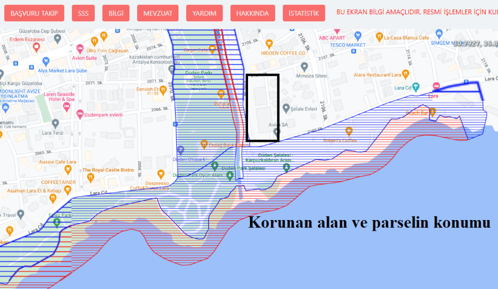 (Düden Çayı’nın denize döküldüğü bölgede ve korunan alanın bitişiğinde yer alan parselde yapılan imar revizyonu ile Özel Sağlık Tesis Alanı’ndan, Ticaret-Turizm Alanı’na dönüştürüldü.)