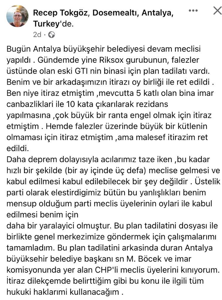 Antalya Büyükşehir Belediyesi’nin CHP’li eski Meclis üyelerinden Recep Tokgöz ise meclis toplantısının ardından yaptığı paylaşımda konuyla ilgili tepkisini dile getirdi. Geçmişte CHP Antalya İl Başkanlığı’nda Sayman olarak da görev yapan Tokgöz, Büyükşehir Belediye Meclisi’nde yapılan oylamada kabul edilen ilgili maddedeki düzenlemenin Fettah Tamince’nin şirketi olan Rixos grubuna ait olduğunu iddia ederek şunları dile getirdi: “Bugün Antalya büyükşehir belediyesi devam meclisi yapıldı. Gündemde yine Rixos gurubunun, falezler üstünde olan eski GTI’nin binası için plan tadilatı vardı. Benim ve bir arkadaşımızın itirazı oy birliği ile reddedildi. Ben niye itiraz etmiştim? Mevcutta 5 katlı olan binanın, imar cambazlıkları ile 10 kata çıkarılarak rezidans yapılmasına, çok büyük bir ranta engel olmak için itiraz etmiştim. Hem de falezler üzerinde büyük bir kütlenin olmaması için itiraz etmiştim ama maalesef itirazım reddedildi. Daha deprem dolayısıyla acılarımız taze iken bu kadar hızlı bir şekilde (bir ay içinde üç defa) meclise gelmesi ve kabul edilmesi, kabul edilebilecek bir şey değildir. Üstelik parti olarak eleştirdiğimiz bütün bu yanlışlıkları benim mensup olduğum parti meclis üyelerinin oyları ile kabul edilmesi benim için daha bir yaralayıcı olmuştur. Bu plan tadilatı dosyası ile birlikte genel merkezimize göndermek için çalışmalarımı tamamladım. Bu plan tadilatının arkasında duran Antalya Büyükşehir Belediye Başkanı Sayın Muhittin Böcek ve imar komisyonunda yer alan CHP’li meclis üyelerini kınıyorum. İtiraz dilekçemde belirttiğim gibi bu konu ile ilgili tüm hukuki haklarımı kullanacağım.”