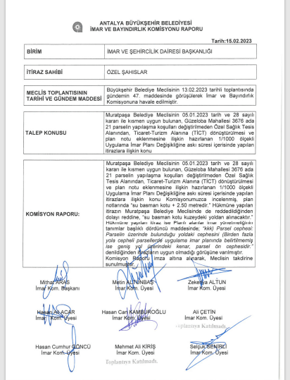 “17 Şubat Cuma günü Antalya Büyükşehir Meclisi’nin şubat ayı devam oturumunda Düden Çayı kenarında ve hemen falezlerin üstünde olan Muratpaşa ilçesi Güzeloba Mahallesi’ndeki 3676 ada 21 parselin plan notlarının ‘Özel Sağlık Tesis Alanı’ndan, Ticaret-Turizm Alanı’na dönüştürülmesine ve imar kat yüksekliğinin artırılmasına’ ilişkin imar planı tadilat kararına yapılan itirazların reddedilerek oy birliği ile Belediye Meclisi’nden geçmesini esefle karşılıyoruz.