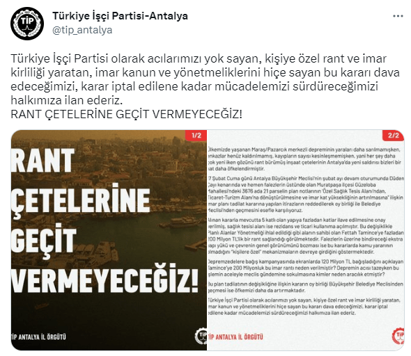 Depremzedelere bağış kampanyasında ekranlarda 120 Milyon TL bağışladığını açıklayan Tamince’ye 200 Milyonluk bu imar rantı neden verilmiştir? Depremin acısı tazeyken bu işlemin aceleyle meclis gündemine sokulmasına kimler neden aracılık etmiştir? Bu plan tadilatının değişikliğine ilişkin kararın oy birliği Büyükşehir Belediye Meclisinden geçmesi ise öfkemizi daha da artırmaktadır. Türkiye İşçi Partisi olarak acılarımızı yok sayan, kişiye özel rant ve imar kirliliği yaratan, imar kanun ve yönetmeliklerini hiçe sayan bu kararı dava edeceğimizi, karar iptal edilene kadar mücadelemizi sürdüreceğimizi halkımıza ilan ederiz.”