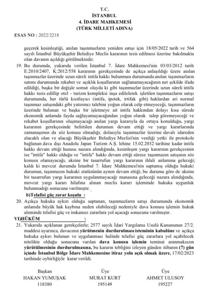 Davaya bakan İstanbul 4. İdare Mahkemesi’nin verdiği yürütmeyi durdurma kararında, arazinin satışıyla ilgili Meclis kararının hukuka aykırı olduğu belirtilerek özetle şu ifadelere yer verildi: “Büyükşehir Belediye Meclisi’nin verdiği yetki ile protokole bağlanan dava dışı Anadolu Japan Turizm A.Ş. lehine 15.02.2032 tarihine kadar intifa hakkı devam ettiği hususu nazara alındığında, kesinleşen yargı kararının gerekçesinin ise ‘intifa’ hakkı olduğu ve ‘intifa’ hakkı devam ettiği sürece taşınmazın satışının söz konusu olamayacağı, aksine bir tasarrufun yargı kararının ihlali anlamına geleceği; kaldı ki mevcut durumda İstanbul 7. İdare Mahkemesi’nin saptamış olduğu hukuki durumun, taşınmazın hukuki statüsünün aynen devam ettiği, bu duruma göre de aksine bir tasarrufun yargı kararının uygulanmayacağı manasına geleceği nazara alındığında, mevcut yargı kararı hilafına alınan meclis kararı işleminde hukuka uygunluk bulunmadığı sonucuna varılmıştır. Açıkça hukuka aykırı olduğu saptanan, taşınmazların satışı durumunda ekonomik anlamda büyük hak kaybına neden olabileceği nedeniyle dava konusu işlemin hukuk aleminde telafisi güç ve imkansız zararlara yol açacağı sonucuna varılmıştır.”