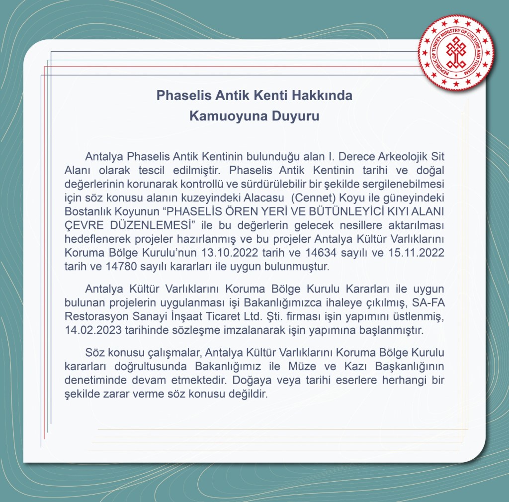 “Phaselis antik kentinin tarihi ve doğal değerlerinin korunarak kontrollü ve sürdürülebilir bir şekilde sergilenebilmesi için söz konusu alanın kuzeyindeki (Cennet) Alacasu Koyu ile güneyindeki Bostanlık Koyu’nun ‘Phaselis Ören Yeri Bütünleyici Kıyı Alanı Çevre Düzenlemesi’ ile bu değerlerin gelecek nesillere aktarılması hedeflenerek projeler hazırlanmış ve bu projeler Antalya Kültür Varlıklarını Koruma Bölge Kurulu’nun 13. 10. 2022 tarih ve 15634 sayılı ve 15. 11. 2022 tarih ve 14780 sayılı kararları ile uygun bulunmuştur.