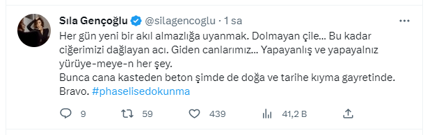 Öte yandan Phaselis’teki yapılaşmayla ilgili tepkiler de sürüyor. Şarkıcı ve söz yazarı Sıla Gençoğlu, sosyal medya hesabından yaptığı paylaşımda Phaselis’e dokunma mesajı vererek şunları yazdı: “Her gün yeni bir akıl almazlığa uyanmak. Dolmayan çile… Bu kadar ciğerimizi dağlayan acı. Giden canlarımız… Yapayanlış ve yapayalnız yürüye-meye-n her şey. Bunca cana kasteden beton şimdi de doğa ve tarihe kıyma gayretinde. Bravo. #phaselisedokunma”