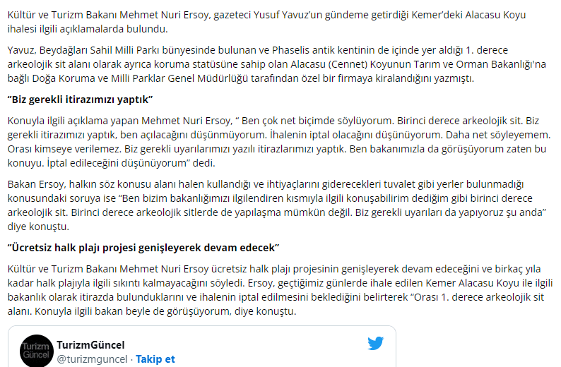 Kültür ve Turizm Bakanı Mehmet Nuri Ersoy, 2 yıl önce Alacasu Koyu’nun 20 yıllığına günübirlik alan olarak kiraya verilmesi üzerine bu girişime karşı çıkarak, “Birinci derece arkeolojik sitlerde de yapılaşma mümkün değil. Biz gerekli uyarıları da yapıyoruz şu anda” ifadelerini kullanmıştı. Aynı koyda bugün Kültür ve Turizm Bakanlığı’nın yapılaşma içeren bir projeyi uygulamaya koyması da kamuoyunun tepkisini çekiyor.