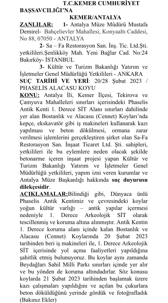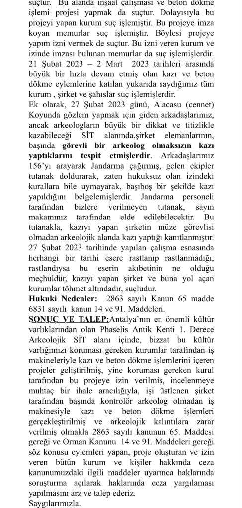 Antalya’nın en önemli kültür varlıklarından olan Phaselis’in sit alanı içerisinde, bizzat bu alanı koruması gereken kurumlar tarafından iş makineleriyle kazı ve beton dökme işlemlerini içeren projeler geliştirildiği vurgulanan suç duyurusunda, “yine koruması gereken kurul tarafından bu projeye izin verilmiş, incelenmeye muhtaç bir ihale aracılığıyla, işi üstlenen şirket tarafından başında kontrolör arkeolog olmadan iş makinesiyle kazı ve beton dökme işlemleri gerçekleştirilmiş ve arkeolojik kalıntılara zarar verilmiş olmakla 2863 sayılı kanunun 65. Maddesi gereği ve Orman Kanunu 14 ve 91. Maddeleri gereği söz konusu eylemleri yapan, proje oluşturan ve izin veren bütün kurum ve kişiler hakkında ceza kanunumuzdaki ilgili maddeler uyarınca haklarında soruşturma açılarak haklarında ceza yargılaması yapılmasını arz ve talep ederiz” ifadelerine yer verildi.