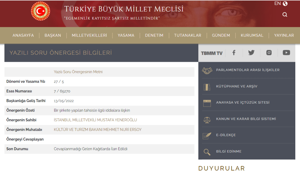 Başka soruları da içeren Yeneroğlu’nun bu önergesi de aynı şekilde yanıtsız bırakıldı. TBMM arşivine baktığımızda, aradan yaklaşık bir yıl geçmiş olmasına rağmen bu soruların yanıtsız kaldığı görülüyor. Meclis arşivinde söz konusu önergeyle ilgili “cevaplanmadığı gelen kâğıtlarda ilan edildi” bilgisi not düşülmüş. Ancak Bakan Ersoy’dan yanıtı istenen sorular halen ortada duruyor.