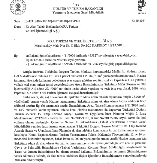 Bakan Ersoy’un ortak olduğu MRA Turizm ve Otel İşletmeciliği A.Ş., 15 Eylül 2021 tarihinde Kültür ve Turizm Bakanlığı’na yaptığı yazılı başvuruda, ek tahsis talebini iletti.