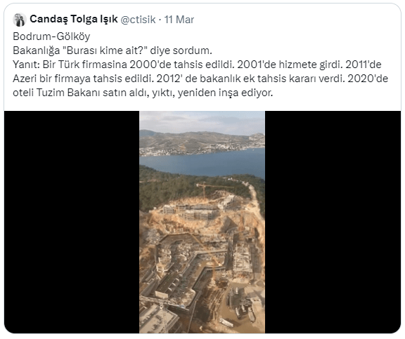 Eski Turizm Bakanı Bahattin Yücel, söz konusu görüntülerin yer aldığı videoyu “turizm sektörünün yüz karası” ifadeleriyle paylaşarak şu ifadeleri kullandı: “Bu görünüm Turizm Bakanının şirketince satın alınan, kendi oluruyla orman arazisinin de katılarak büyütüldüğü bir otel inşaatına aittir.50 yıldır her kademesinde hizmet ettiğim Turizm Sektörünün yüz karasıdır. Seçimlerden sonra hesabı sorulmalıdır.” (https://twitter.com/bahattinyucel/status/1634566582453108739)