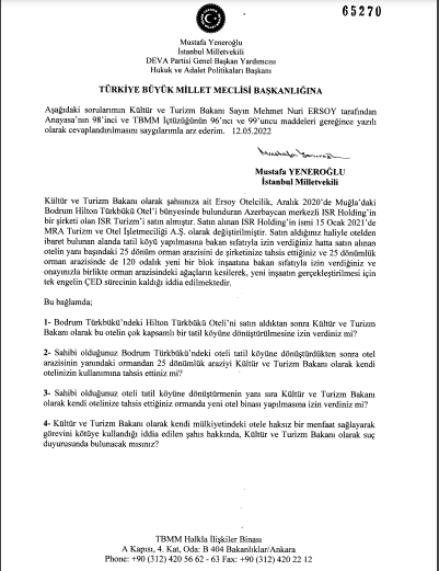 Söz konusu projeye ilgili orman arazisi tahsisi gündeme geldiğinde, Deva Partisi İstanbul Milletvekili Mustafa Yeneroğlu da 12 Mayıs 2022 tarihinde TBMM’ne bir soru önergesi sunarak Bakan Ersoy’a “Sahibi olduğunuz Bodrum Türkbükü’ndeki oteli tatil köyüne dönüştürdükten sonra otel arazisinin yanındaki ormandan 25 dönümlük araziyi Kültür ve Turizm Bakanı olarak kendi otelinizin kullanımına tahsis ettiniz mi?” diye sormuştu.