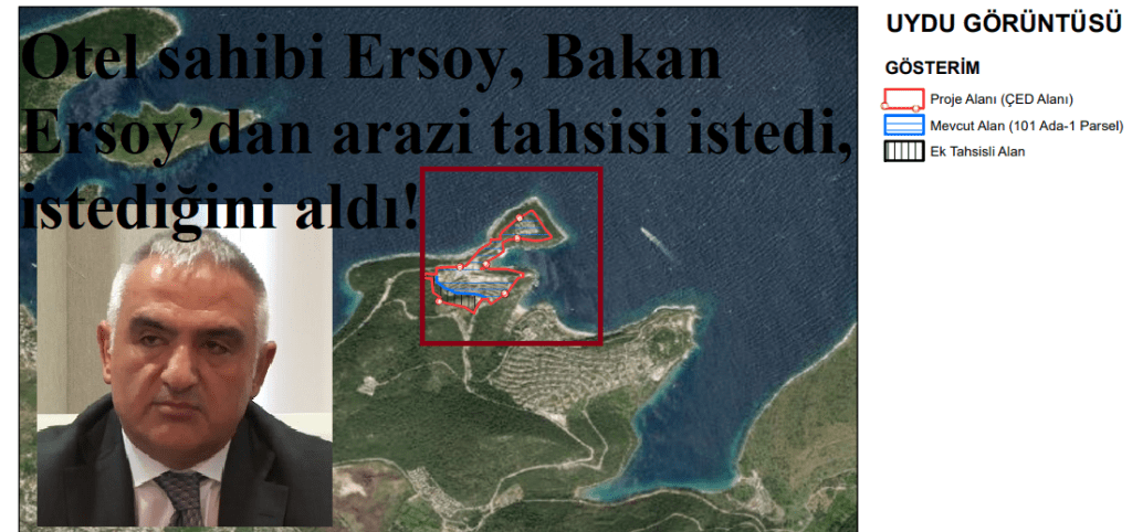 Ancak Bakan Ersoy’un ortağı olduğu MRA şirketi, 49 yıllığına üst kullanım hakkı bulunan Saplıburun Mevkii’ndeki tahsisli araziye bitişik konumdaki 25 bin m2’lik Hazineye ait orman arazisini de gözüne kestirerek yeni otel projesine dâhil etmek istiyordu.