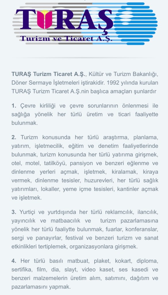 Ankara’daki kurumlararası vergi ödeme listesinde ilk 100 firma arasında olduğu belirtilen TURAŞ Turizm Ticaret A.Ş’nin resmî web sayfasında, 1982’de kurulan şirketin, Kültür ve Turizm Bakanlığı, Döner Sermaye İşletmeleri iştiraki olduğu belirtilerek amaçları özetle şöyle sıralanıyor: “Çevre kirliliği ve çevre sorunlarının önlenmesi ile sağlığa yönelik her türlü üretim ve ticari faaliyette bulunmak. Turizm konusunda her türlü araştırma, planlama, yatırım, işletmecilik, eğitim ve denetim faaliyetlerinde bulunmak, turizm konusunda her türlü yatırıma girişmek, otel, motel, tatilköyü, pansiyon ve benzeri eğlenme ve dinlenme yerleri açmak, işletmek, kiralamak, kiraya vermek, dinlenme tesisler, huzurevleri, her türlü sağlık yatırımları, lokaller, yeme içme tesisleri, kantinler açmak ve işletmek.”