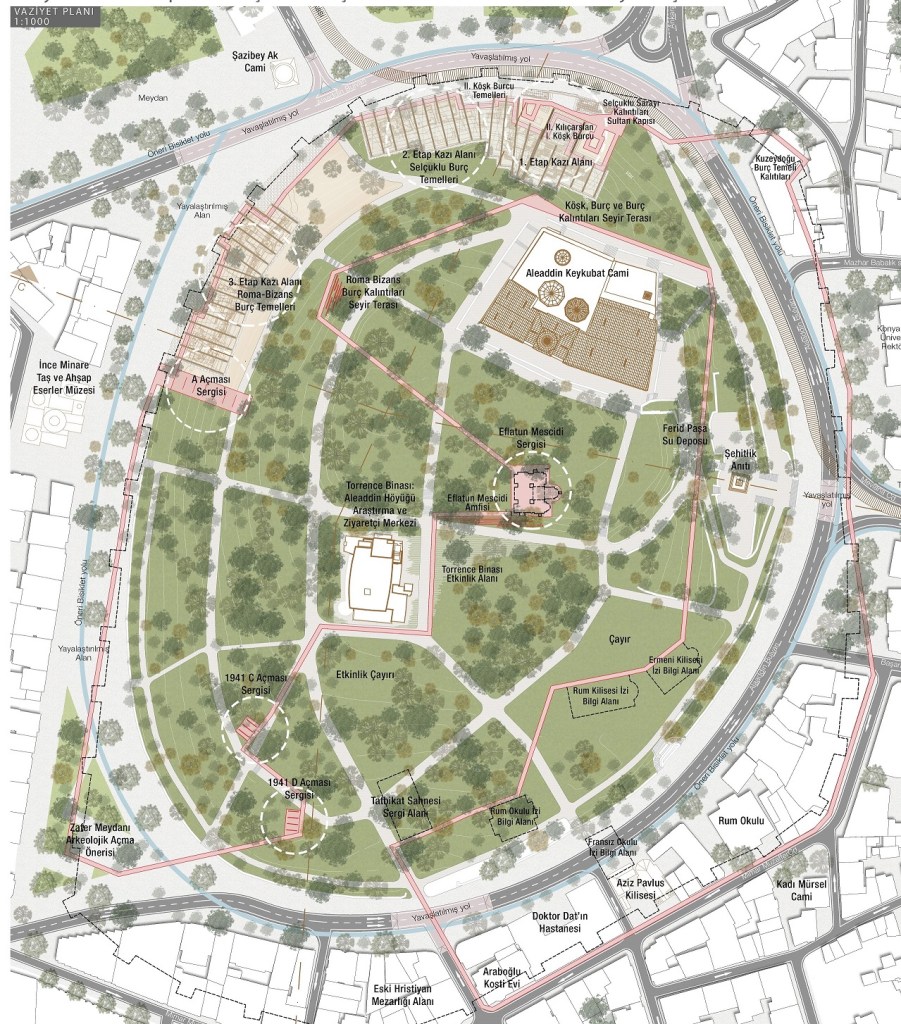 Binlerce yıldır kentin kalbi konumundaki Alaaddin Tepesi’de uygulanması planlanan projenin raporunda, Kılıçarslan Köşkü’nden günümüze ulaşan son kalıntı ve yapılacak uygulama hakkında şu bilgilere yer veriliyor: “Köşkün mevcut taş bazası tarihiymiş gibi bir algı yaratsa da aslında beton şemsiye döneminden kalan betonarme temeller kaplanarak oluşturulmuş. Köşkün geometrisiyle asimetrik oluşu da bu sebepten. Tarihiymiş gibi görünen bu bazanın, köşke zarar vermeyecek kadar kısmını sökmek, dışına sağlam temelli bir destek yapmak, bu desteğin de çağdaş bir tasarım olduğunu belli etmek gerekiyor. Tasarladığımız bu yeni destek bazası üzerinde, köşkün görünürlüğünü engellememek, tepe ve Ulu Cami silüetini baskılamamak için strüktürel cam ile taşınan bir üst örtü tasarladık. Bu ‘müze vitrini’nin erişilemez, yaklaşılamaz olmaması adına kontrollü şekilde içine girilen, köşkü çok yakından görmeye imkân veren bir yürüyüş yolu oluşturduk. Köşkün, özellikle kerpiç kısımların ısı ve nem dengesini sağlamak ve içinde bulunduğu havayı temiz tutmak için aktif ve pasif iklimlendirme sistemleri tasarlandı. Pasif sistemde baza içindeki menfezlerden, filtreler ile içeri giren havanın, üst örtüdeki menfezlerden dışarı çıkması hedeflendi.”