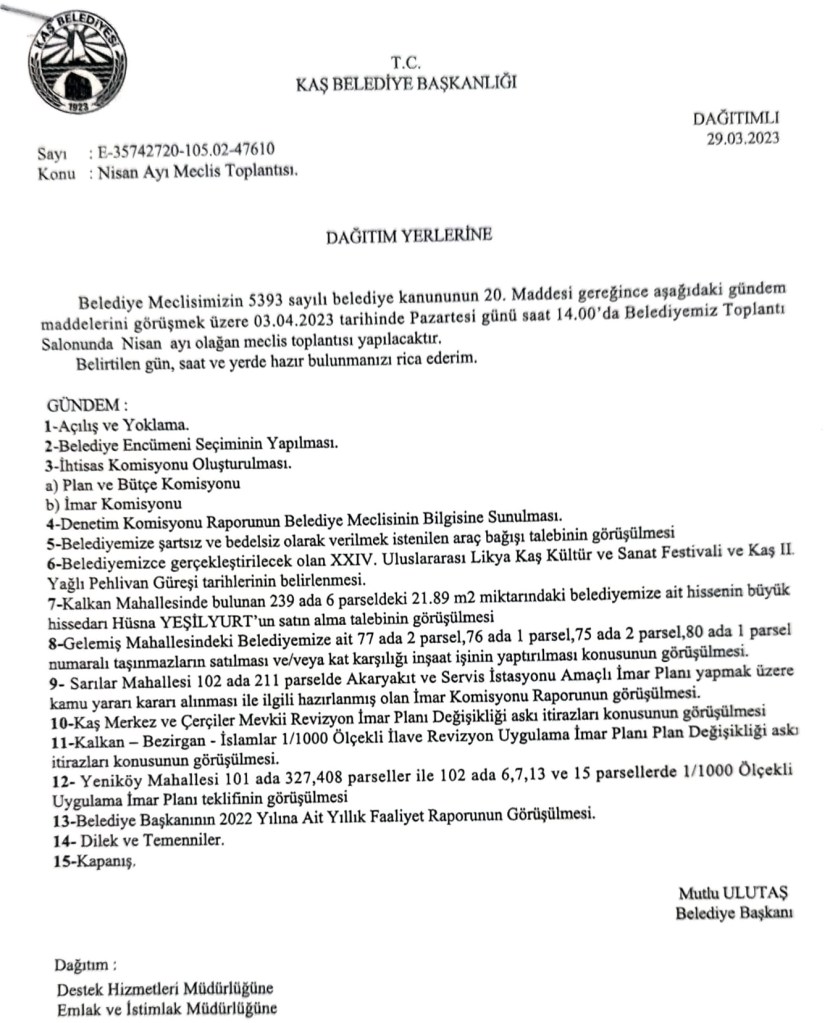 AKP’li Kaş Belediyesi’nin 3 Nisan Pazartesi günü yapacağı Meclis Toplantısının da gündemine alınan arazi satışıyla ilgili maddede şu ifadelere yer verildi: “Gelemiş mahallesi ndeki belediyemize ait 77 ada 2 parsel, 76 ada bir parsel, 75 ada 2 parsel, 80 ada 1 parsel numaralı taşınmazların satılması ve/veya kat karşılığı inşaat işinin yaptırılması konusunun görüşülmesi.”