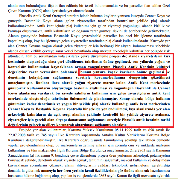 (Bakanlığın Mahkemeye sunduğu savunmada, Phaselis’teki projenin yapımına ilişkin gerekçeler arasında yangınların önlenmesi, kaçak kazıların önüne geçilmesi ve kıyı tahribinin önlenmesi gibi nedenler de sıralanıyor.)