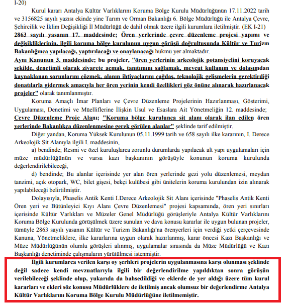Antalya Kültür Varlıklarını Koruma Bölge Kurulu’nun 26 Ekim 2022 tarihinde yaptığı 402. toplantısının ek gündem maddesi olarak görüşülen Phaselis’teki projeyle ilgili karşı oy kullanan Kurul üyesi DKMP Bölge Müdürlüğü temsilcisinin gerekçesi ortaya çıktı.